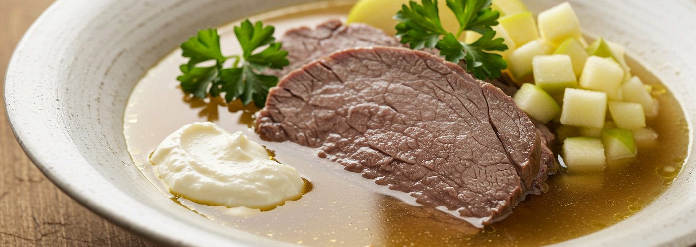 Once the cooking is complete, the broth is strained, and the meat is sliced into generous pieces for serving. The rich broth can be enjoyed as a starter, while the meat is typically served alongside traditional condiments such as grated horseradish and minced apples, which offer a delightful contrast to the savory flavors of the Tafelspitz.