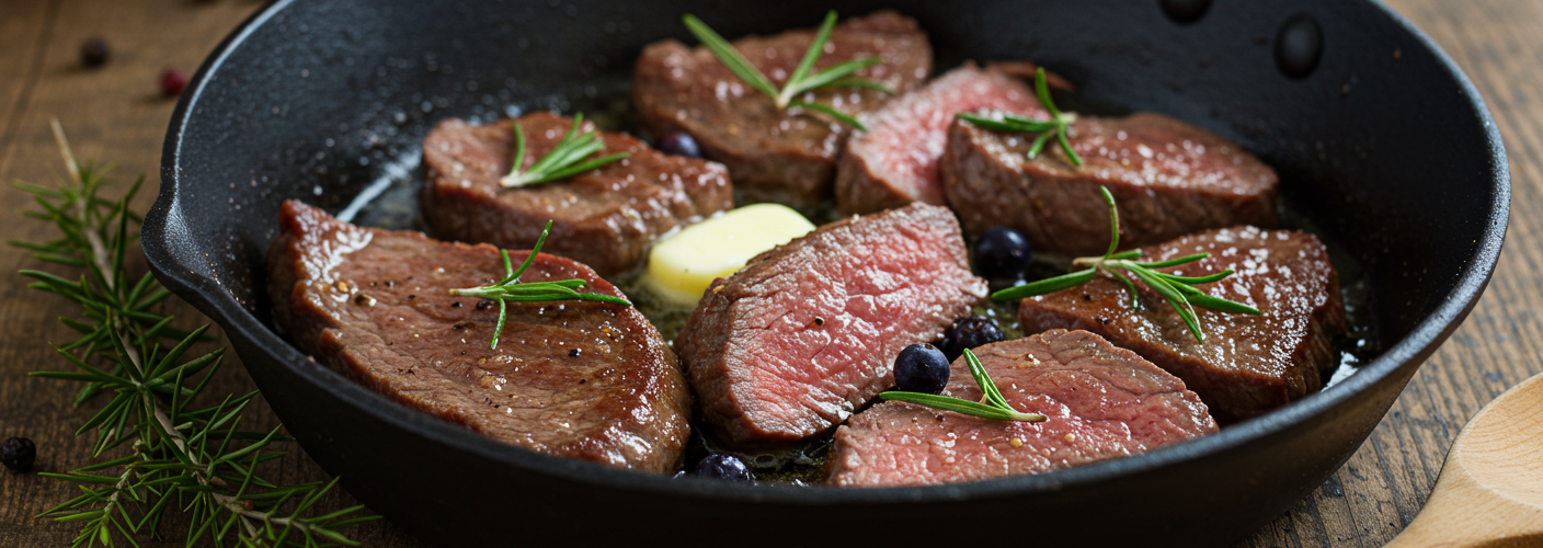 3. Increase the heat and add the sliced reindeer meat, searing it quickly to lock in moisture.